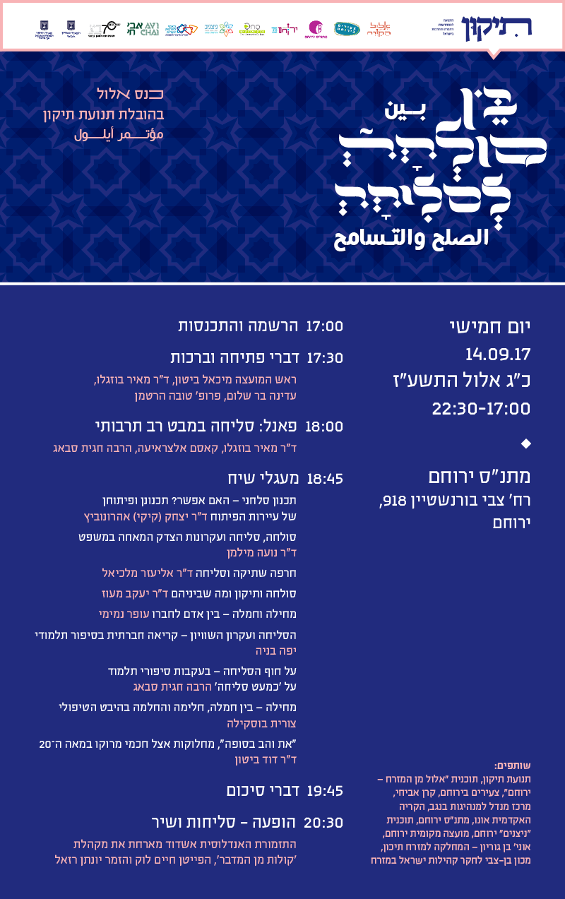 לקראת ערב השנה החדשה יתקיים בירוחם ביום חמישי, 14.9.17 בשעות 22:00-17:00 כנס אלול: בין סולחה לסליחה.